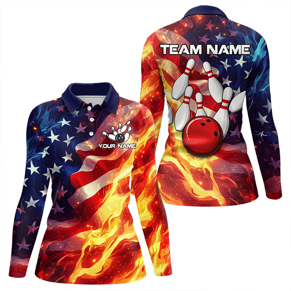 Flame American Flag Bowling Polo, Quarter Zip shirts for Women Custom Patriotic Team Bowling Jersey NQS9360