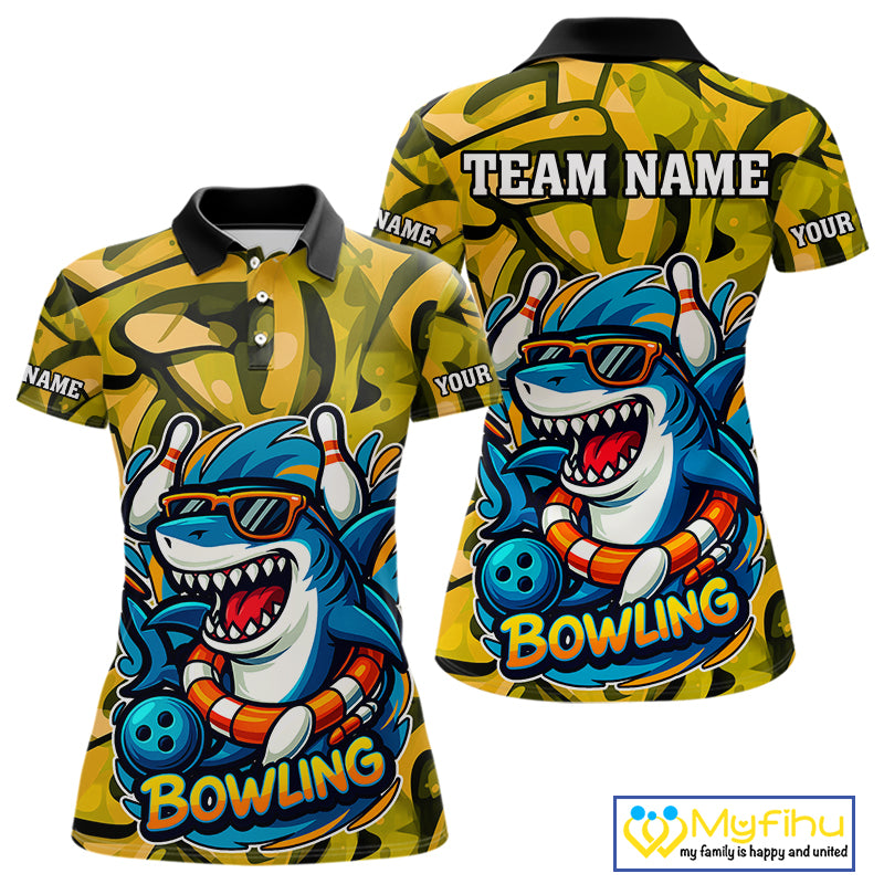 Funny Yellow Camo Shark Women Bowling Polo, Quarter Zip Shirt Custom Team Shark Bowling Outfit Jersey NQS10077