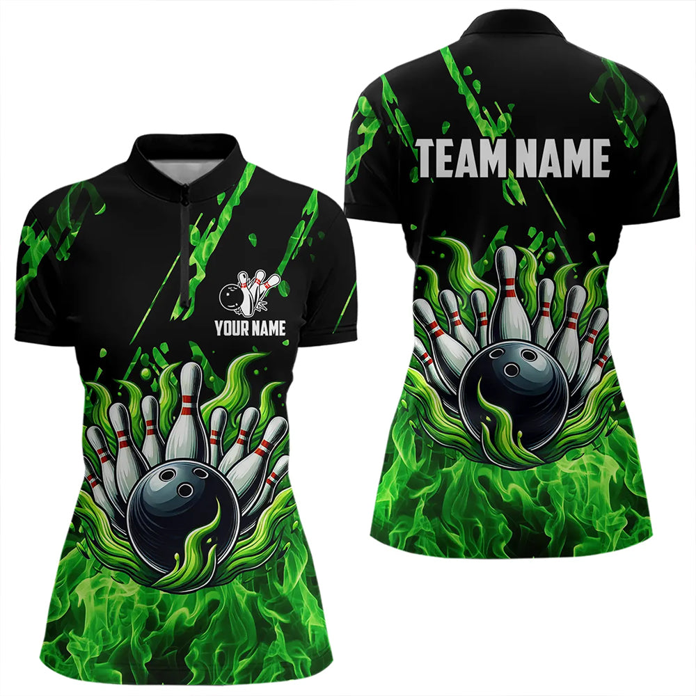 Green Flame Bowling Polo, 1/4 Zip jerseys for Women Custom Bowling Team jerseys for bowlers NQS9600