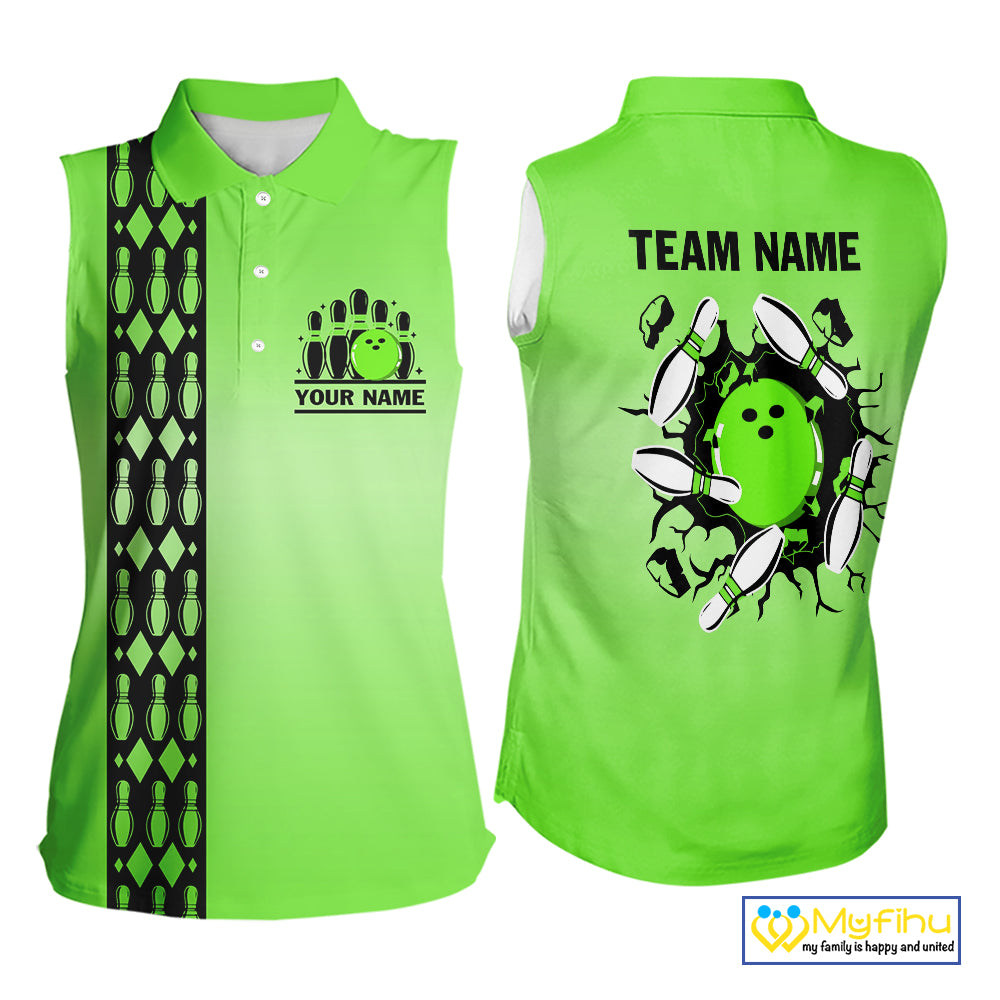Personalized Black and Green Retro Bowling Sleeveless Polo Team Shirt For Women Custom Bowling Gift NQS10460
