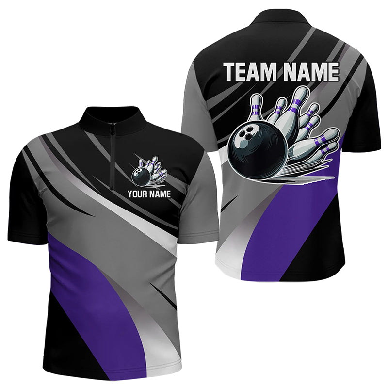 Personalized Black, Gray and Purple Bowling Shirts For Men, Bowling Balls And Pins Bowling Team Shirts NQS9785