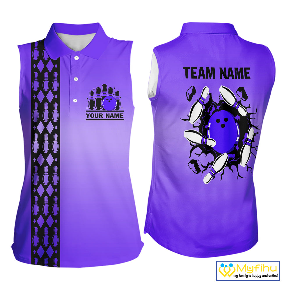 Personalized Black & Purple Retro Bowling Sleeveless Polo Team Shirt For Women Custom Bowling Gift NQS10461
