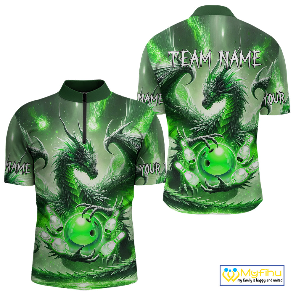 Personalized Green Lights Dragon Mens Bowling Polo, 1/4 Zip Shirt Custom Team Bowling League Jersey NQS10199
