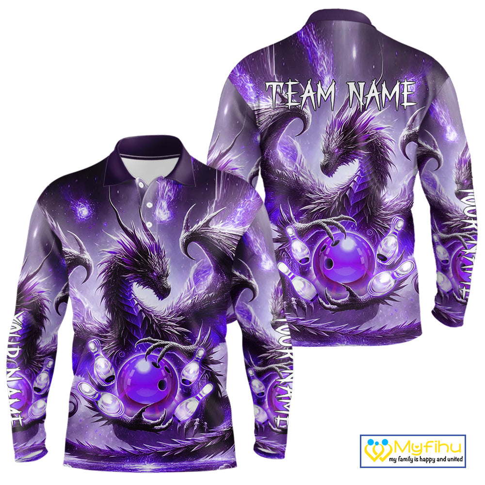 Personalized Purple Lights Dragon Mens Bowling Polo, 1/4 Zip Shirt Custom Team Bowling League Jersey NQS10200