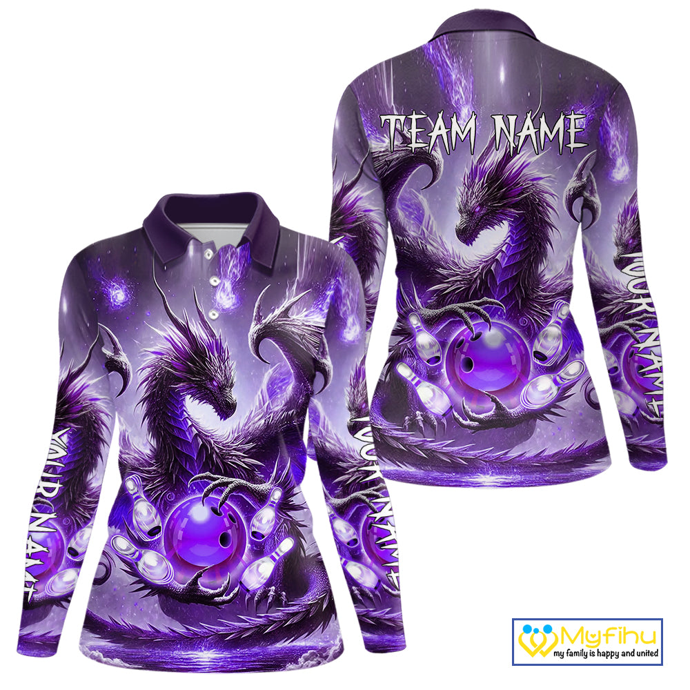 Personalized Purple Lights Dragon Women Bowling Polo, 1/4 Zip Shirt Custom Team Bowling League Jersey NQS10200