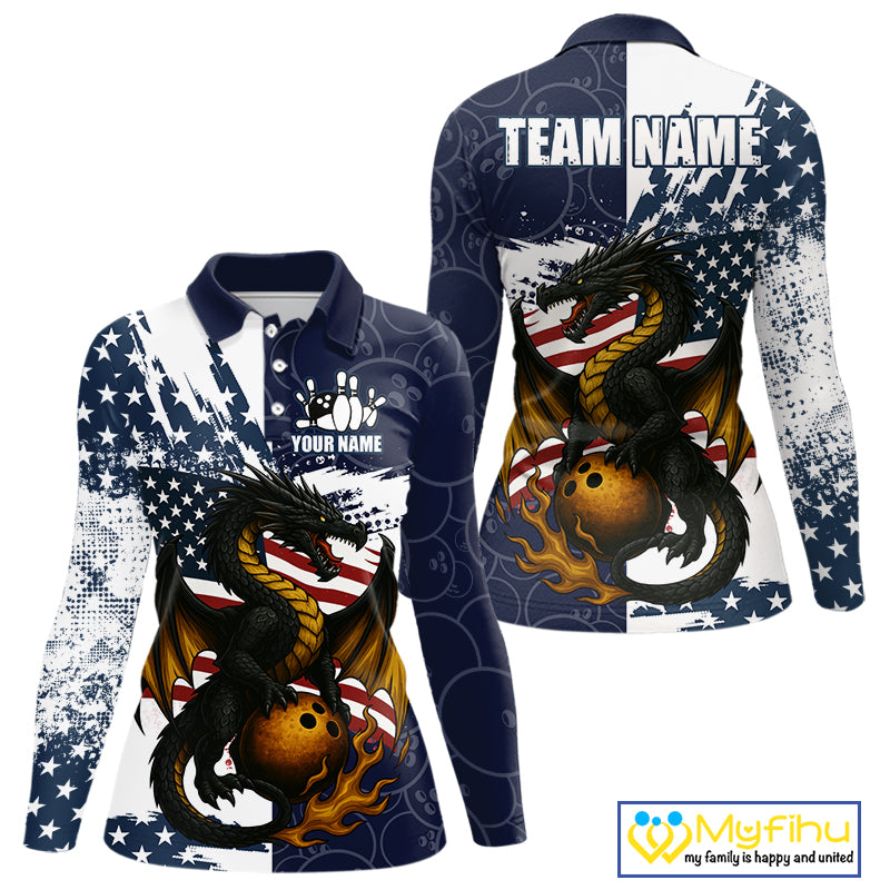 Red, White and Blue American Flag Dragon Bowling Shirt For Women Custom Patriotic Bowling Team Jersey NQS10294