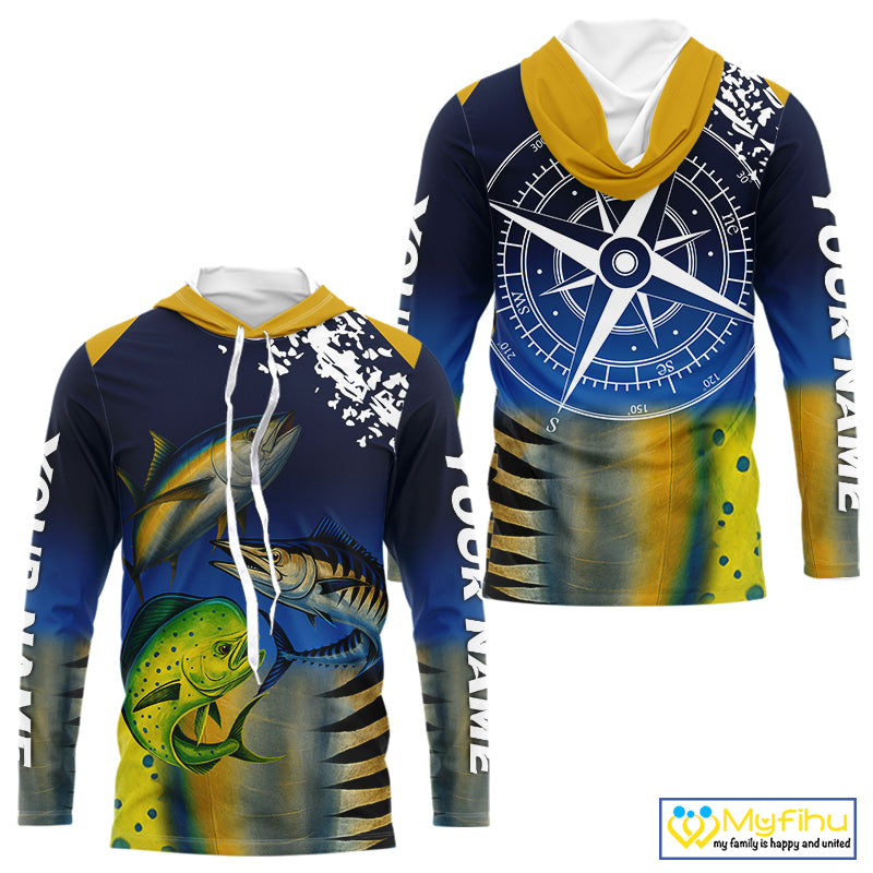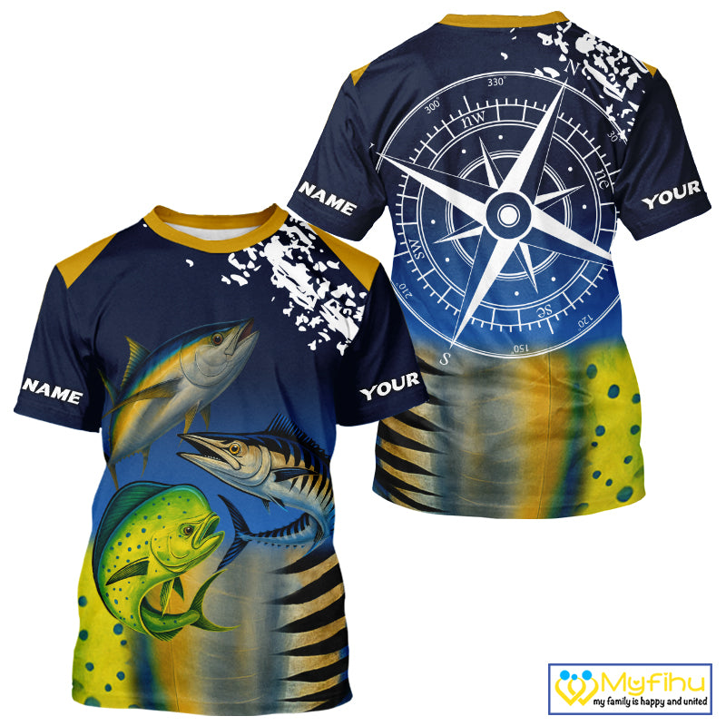 Personalized Mahi Mahi, Wahoo, Tuna scales blue Fishing Shirts, compass offshore tournament Shirts NQS10371