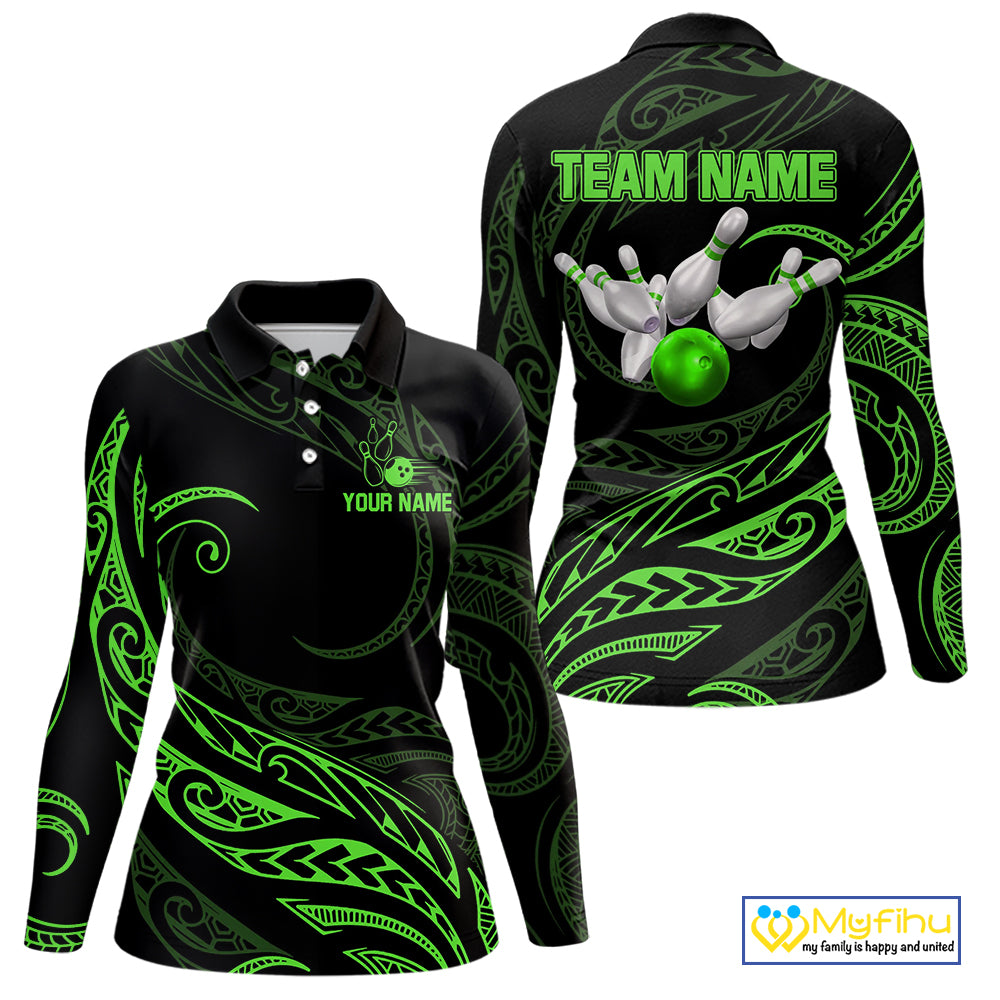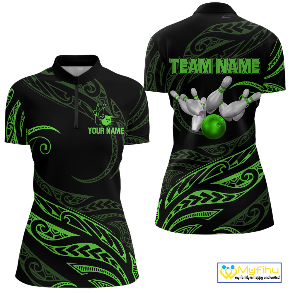 Black and Green Tribal Pattern Bowling Polo, Quarter Zip shirts For Women Custom Team Bowling Jerseys NQS10484