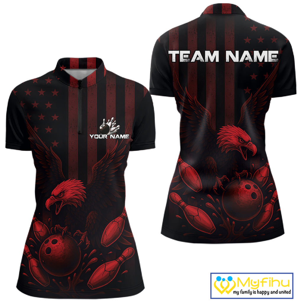 Black and Red American Flag Eagle Bowling Shirt For Women Custom Patriotic Team bowling jerseys NQS10480