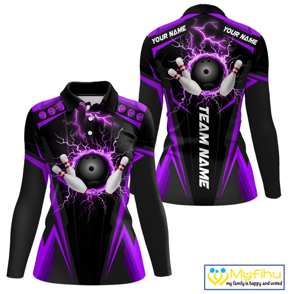 Black Women bowling Polo, 1/4 Zip shirt Custom lightning thunder team league bowling jersey | Purple NQS10375