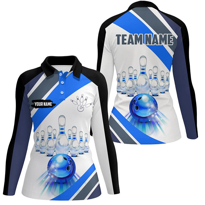 Blue Light Bowling Polo, Quarter Zip Shirt for Women Custom Bowling ball and pins Team League Jerseys NQS7586