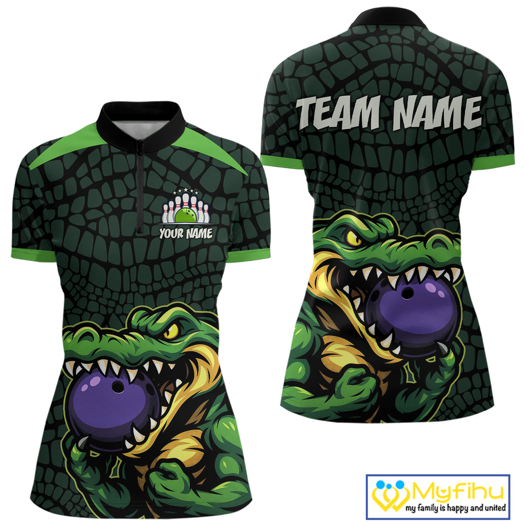 Green Alligator Bowling Polo, Quarter Zip shirts for Women Custom Team bowling uniform jersey NQS10734
