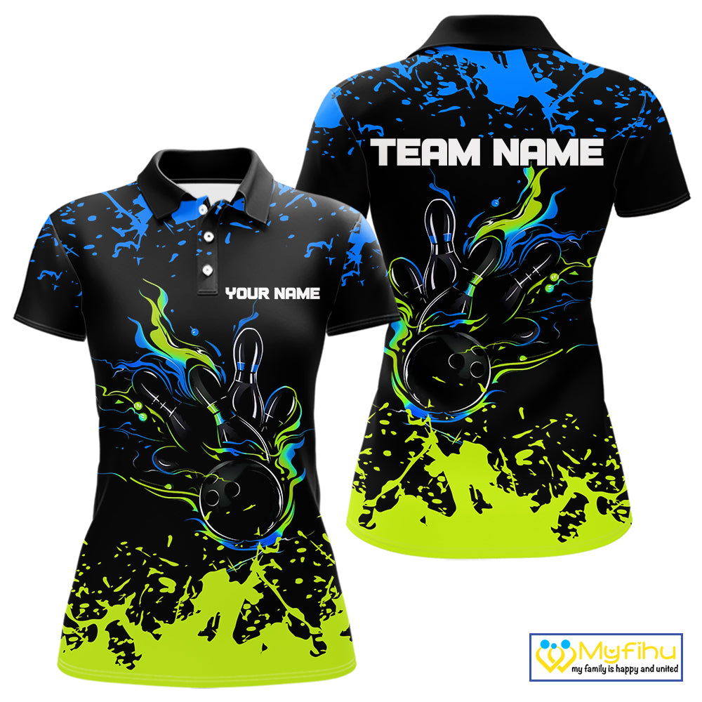 Personalized Black, Blue and Green Bowling Shirts For Women, Bowling Ball & Pins Bowling Team Shirts NQS10741