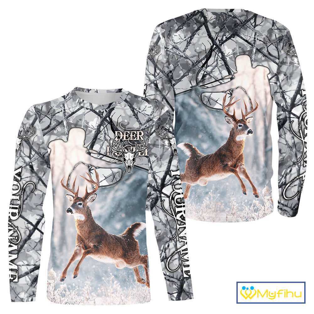 Beautiful Deer Hunting Shirt Camo Gray 3D Full Body Jumping Whitetail Deer Custom Name NHT94