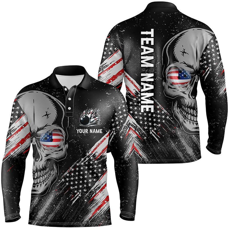 Black American flag retro bowling league jerseys custom skull Men Bowling Polo Shirt, gifts for bowler NQS7158