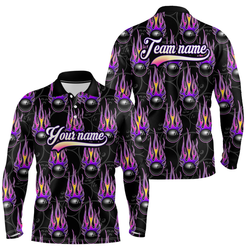 Black Bowling Ball Camo Purple Flame Bowling Polo, 1/4 Zip Shirt for Men Custom Bowling Team Jersey NQS8939