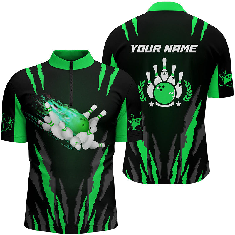 Bowling Quarter Zip shirts for men custom name Flame Bowling Ball and Pins bowling jerseys | Green NQS4541