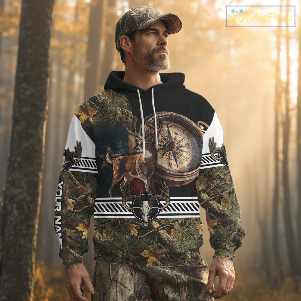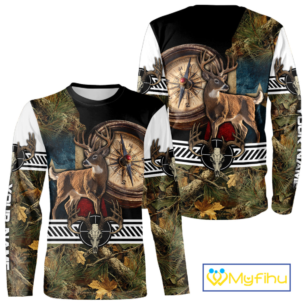 Deer Hunting Shirt Compass Design Forest Camo Custom Name Whitetail Deer Hunting Clothes NHT85