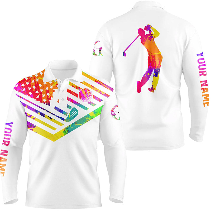 Mens golf polo shirt watercolor American flag 4th July custom name patriotic white golf shirt NQS3549