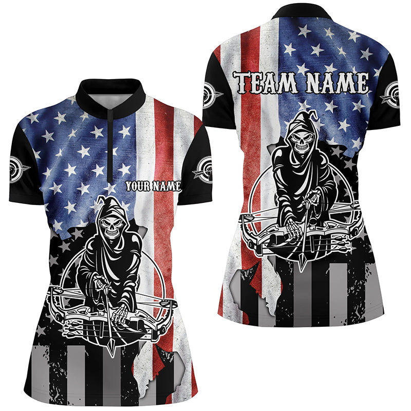 Skeleton Playing Archery Custom US Flag Women Quarter-Zip Shirts Best Unique Archery Shirts  TDM0520