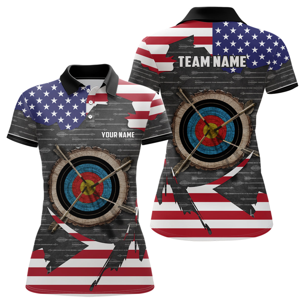 Retro Archery 3d Target Personalized US Flag Polo Shirts For Women, Patriotic Archery Jerseys Shirts TDM0708