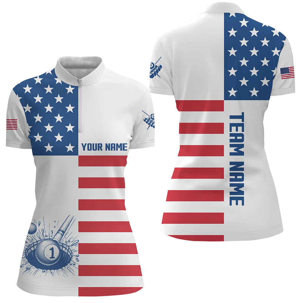 Personalized American Flag Billiard Quarter-Zip Shirt, Patriotic Pool Player Shirt For Women TDM1030