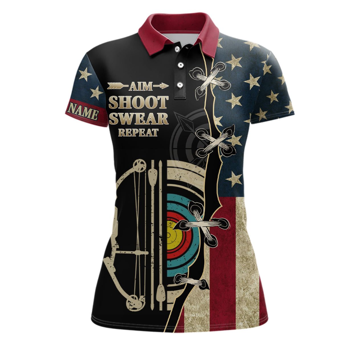 Personalized Aim Shoot Swear Repeat US Flag Archery Polo Shirts For Women Custom Retro Target Archery Shirts VHM0660