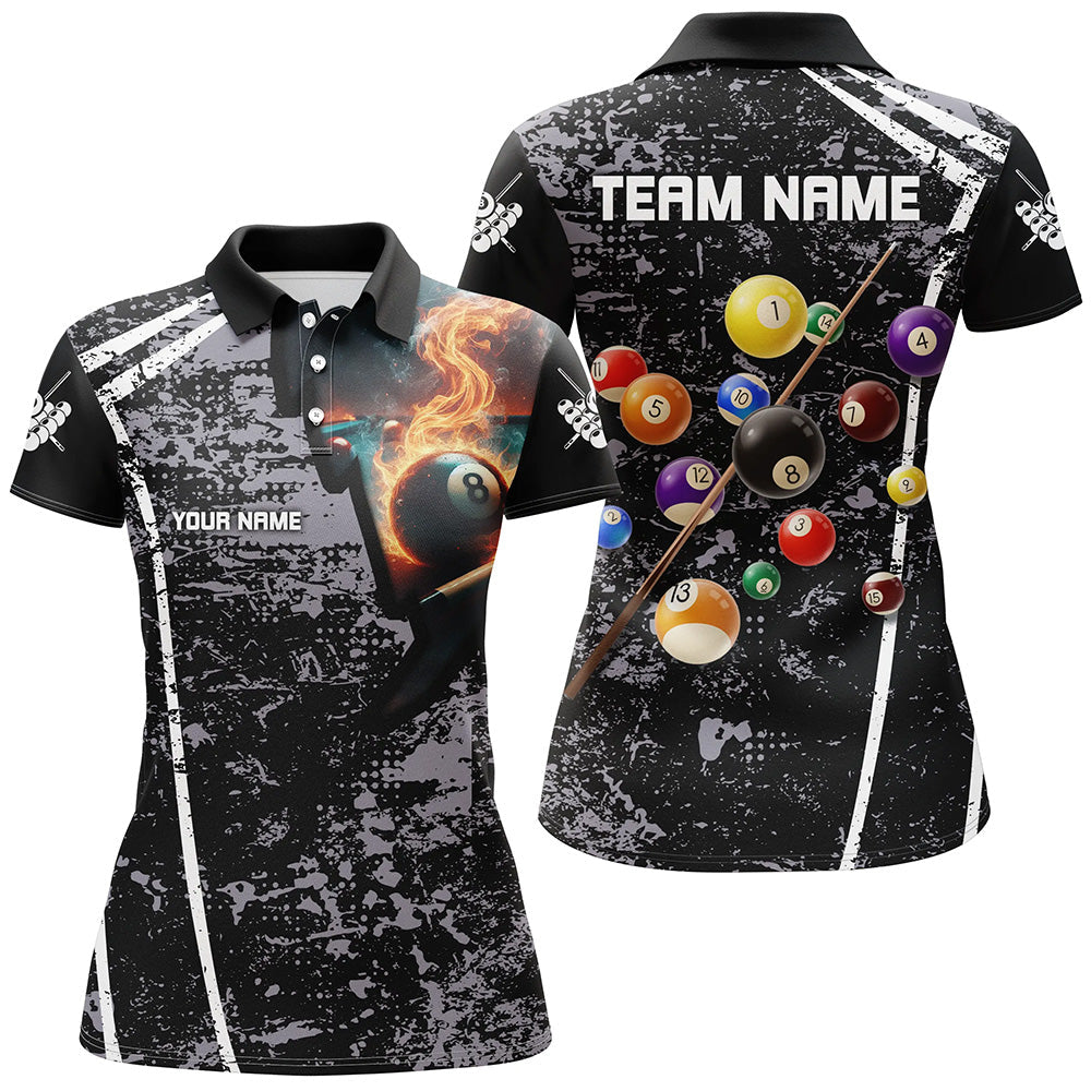 Personalized Grey Grunge Fire 8 Ball Billiard Polo Shirts For Women, 3D Pool Balls Billiard Jerseys VHM0952