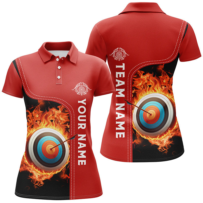 Personalized Black Red Flaming Target Archery 3D Polo Shirts For Women, Custom Archery Team Jerseys VHM0985