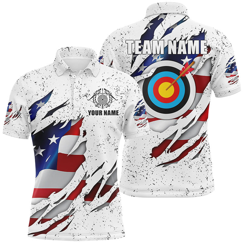 Personalized White Grunge US Flag Target Archery 3D Polo Shirts For Men, Custom Archery Team Shirts VHM0991