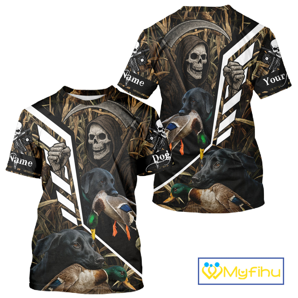 Waterfowl Hunting Shirt Camo Personalized with Black Lab Dog and Grim Reaper, Hunting Gifts NHT168