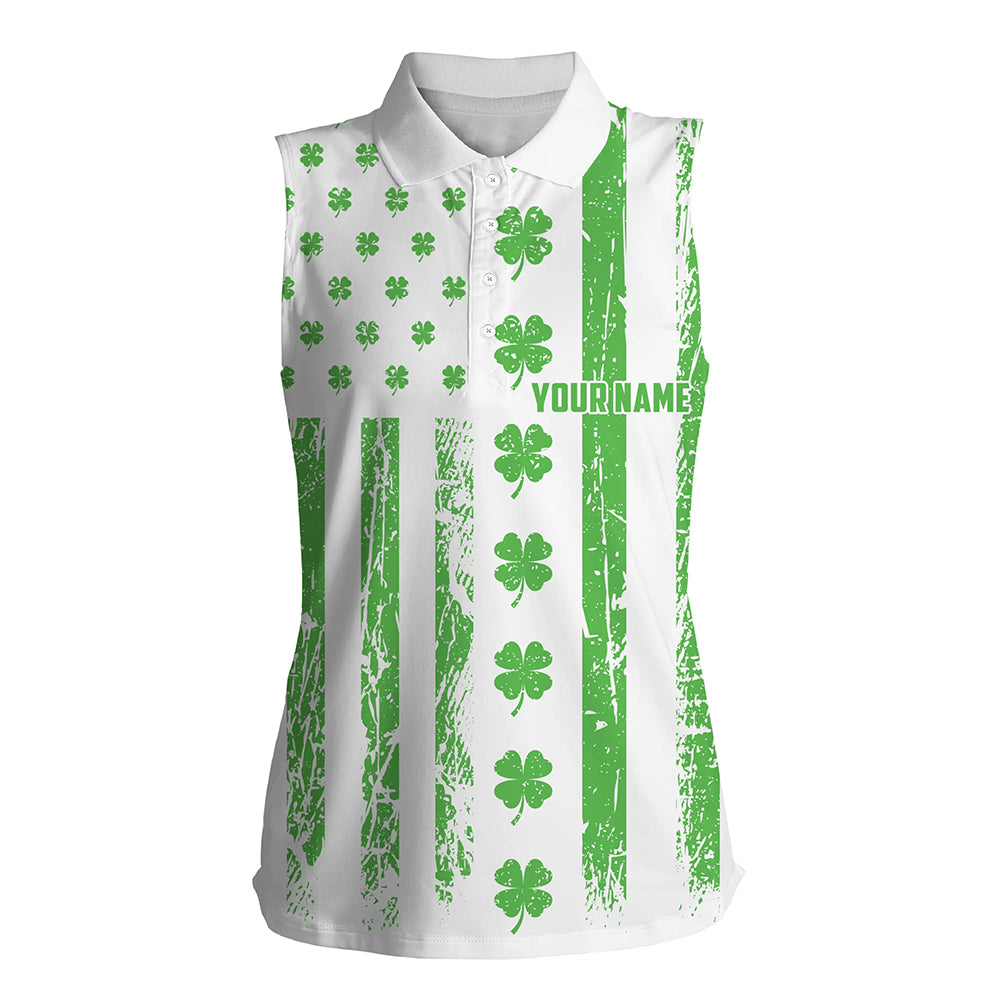 St Patrick Day American Flag Womens Sleeveless Polo Shirt Green Clover Patriotic Golf Tops For Women LDT1356