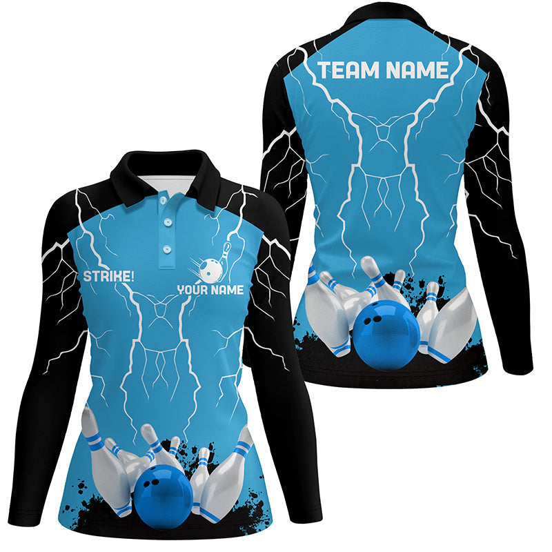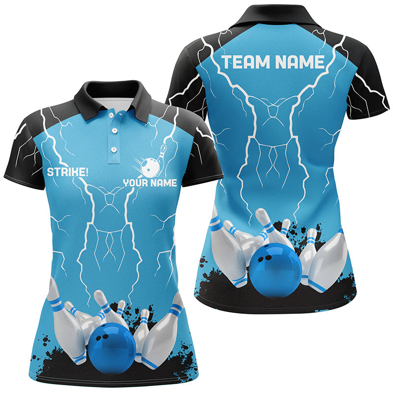 Women bowling polo shirt Custom bowling strike lightning storm thunder team league jerseys | Blue NQS7084