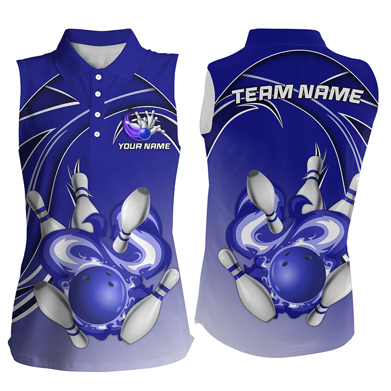 Women Bowling sleeveless Polos Custom Bowling ball pins Team league Jerseys, gifts for bowlers | Blue NQS7073
