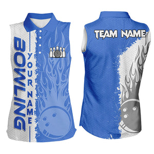 Women sleeveless polo shirts Custom white and blue flame Bowling ball and pins Team league Jerseys NQS7103