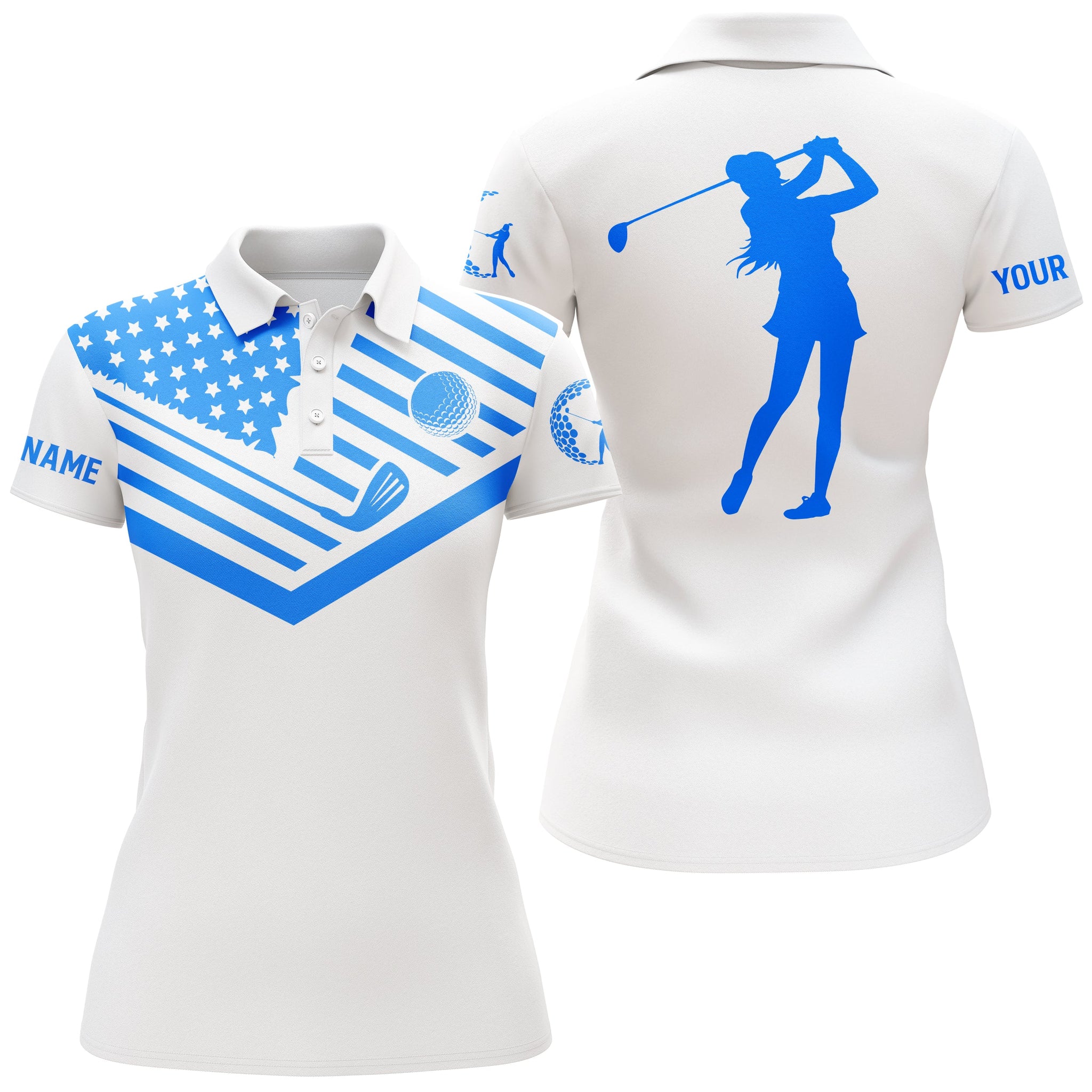 Womens golf polo shirt blue American flag custom name white golf shirt NQS3633
