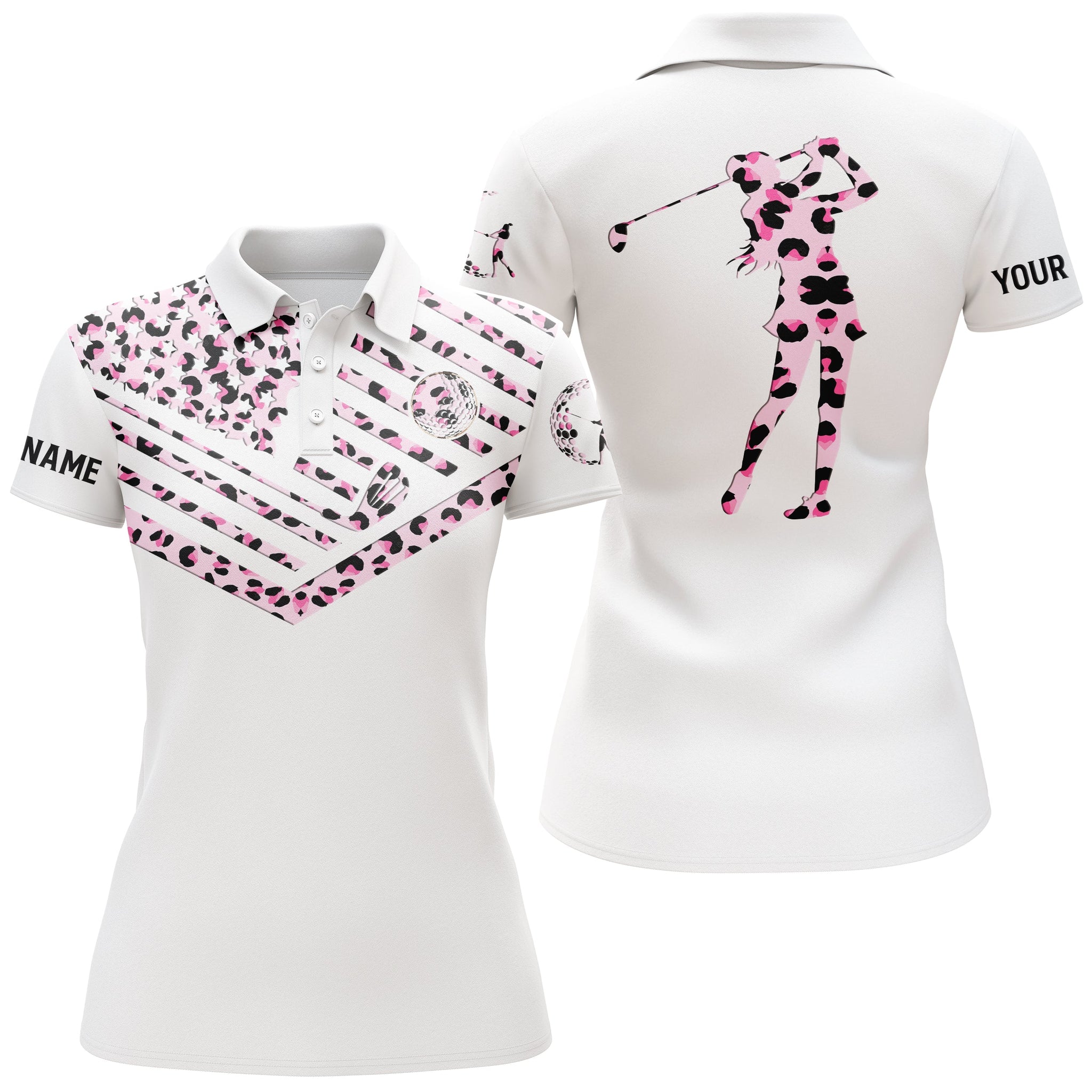 Womens golf polo shirt pink leopard American flag custom name white golf shirt NQS3636